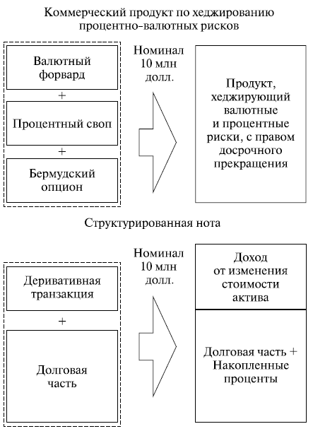 На рис. 4.6 представлены коммерческий продукт, сконструированный для эмитента с целью хеджирования валютных и процентных рисков, и розничный продукт в виде структурированной ноты.