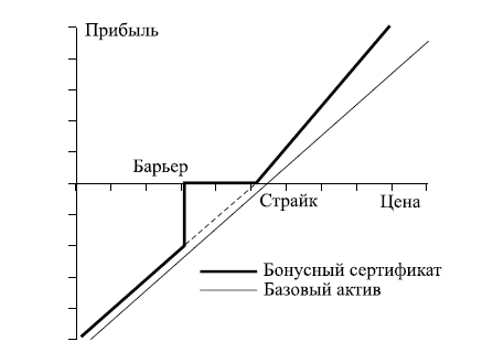 Бонусный сертификат предлагает частичную гарантию возврата первоначального капитала, пока цена базового актива не опустится ниже определенного уровня. Это достигается с помощью использования барьерного опциона «Down and in».