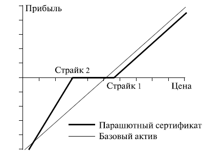 Парашютные сертификаты представляют собой сочетание нот с полной защитой капитала и повторяющих сертификатов. Держатель сертификата имеет возможность получить доход от роста цены базового актива, в то же время он имеет финансовую подушку в случае ее падения.