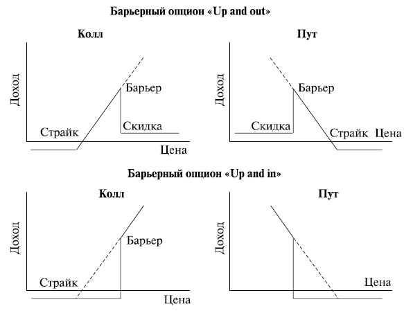 Барьерными (barrier option) называются опционы, выигрыш которых зависит от того, превысит ли цена базового актива за определенный период времени заранее установленный уровень. Барьерные опционы разделяются на включаемые (knock-in) и выключаемые (knock-out). Выключаемые барьерные опционы действуют, пока цена базового актива не достигнет определенного уровня. Включаемые барьерные опционы, наоборот, вступают в силу тогда, когда цена актива достигнет определенного уровня (рис. 4.14). Выделяют следующие типы барьерных опционов колл/ пут: опцион колл/пут «Down and out»/«Down and in» и опцион колл/пут «Up and out»/«Up and in».
