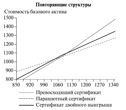 Продукты, повторяющие динамику базового актива, аналогичны прямому инвестированию средств в базовый актив, и их доходность прямо пропорциональна динамике цен базового актива. Основное преимущество их заключается в том, что они предоставляют держателям возможность инвестировать средства в базовые активы развивающихся стран, доступ к которым ограничен для рядовых инвесторов. Также зачастую они предоставляют возможность вложить средства в базовый актив и получить прибыль в отношении большем, либо равным 1:1. Наиболее интересны: бонусный сертификат (bonus certificates) и парашютный сертификат (airbag certificate).