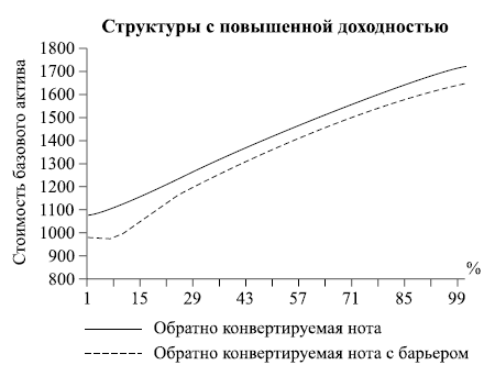 Ценовое поведение продуктов с повышенной доходностью определяет наличие фиксированного дохода, формируемого за счет продажи опциона пут «в деньгах». Каждый год купон выплачивается, из-за чего происходит резкое падение цены. При стабильном состоянии рынка динамика продукта имеет «лестничный» характер выплат, отражающий выплату накопленного купонного дохода.