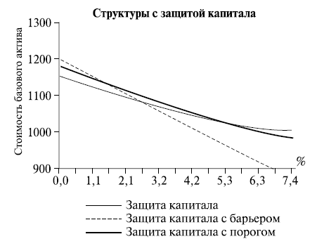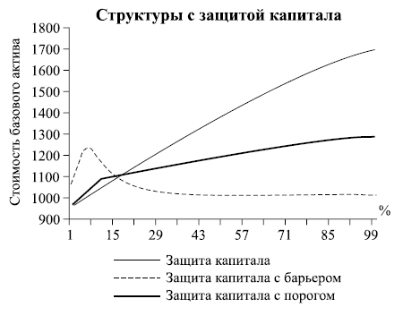 Ценовое поведение продуктов с защитой капитала. Доходность продуктов не превышает доходность базового актива из-за низкого коэффициента участия.
