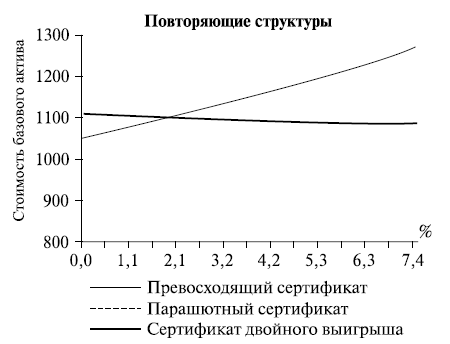 Ценовое поведение повторяющих продуктов аналогично динамике базового актива. При стабильном состоянии рынка стоимость продуктов выше цены спот за счет высокого коэффициента участия, а при падении полностью повторяет ее. Оптимальным продуктом в данной категории выступает парашютный сертификат. Его доходность выше, чем доходность базового актива как на стадии роста, так и на стадии падения. Рост процентных ставок приводит к росту цены за счет падения стоимости опциона пут и роста цены опциона колл.