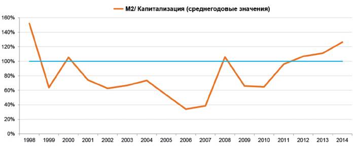Превышение показателем М2/Капитализация уровня 100% может свидетельствовать о недооцененности фондового рынка. В этот момент спрос на деньги столь высок, а активы выставляются на продажу по столь низким ценам, что суммарная стоимость активов становится ниже общего количества денег.