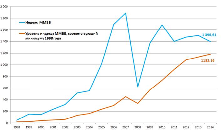 Минимальное значение индекса ММВБ – 18,53 было зафиксировано в 1998 году. Это худшая оценка стоимости российских компаний на фоне максимального уровня пессимизма. Соотношение денежной массы (показатель М2) к капитализации фондового рынка в августе 1998 года составляло 373%, а монетизация экономики – 17,3%. Соотношение денежной массы, ВВП и капитализации фондового рынка в 1998 году позволило сформировать коэффициент, соответствующий «худшим ожиданиям». В настоящее время с точки зрения экономического развития наша страна стала намного сильнее по сравнению с 1998 годом. Соответственно, используя полученный коэффициент для 1998 года с поправкой на текущие значения ВВП, денежной массы и монетизации, можно вычислять значения индекса, соответствующие «худшим ожиданиям».