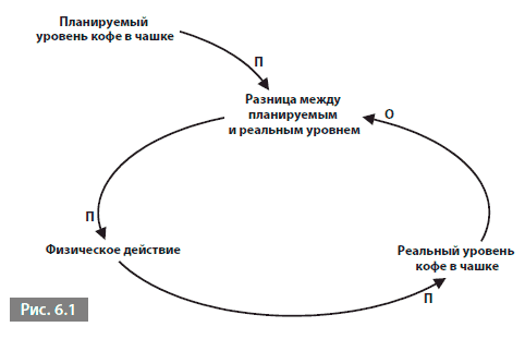 Теперь давайте предположим, что я нечаянно вылил слишком много, и теперь реальный уровень кофе в чашке ниже планируемого. Таким образом, разница между планируемым и реальным уровнем – положительное число, и я выполняю положительное физическое действие, поскольку мы имеем связь типа П. Это означает, что я наливаю кофе обратно, что логично. На реальный уровень кофе в чашке оказывается положительное влияние (опять связь типа П), и он опять повышается, что тоже логично. Рост реального уровня кофе в чашке вызывает сокращение разницы между планируемым и реальным уровнем (связь типа О). Тот факт, что разница между планируемым и реальным уровнем становится меньше, предполагает, что система стремится к своей цели.