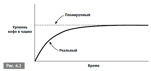 Происходящее гораздо легче оценить с помощью графика, демонстрирующего несколько преувеличенную форму поведения реального уровня кофе в чашке во времени (рис. 6.3).