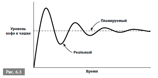 Как вы помните, в качестве планируемого уровня кофе у нас задано полчашки, поэтому, если я отвлекусь хотя бы на секунду, я налью больше, но, вероятно, замечу это прежде, чем кофе перельется через край. Что произойдет дальше? Я осторожно наклоню чашку и вылью лишний кофе, но если я опять буду неосторожен, то могу наклонить ее слишком сильно, и тогда мне придется опять доливать кофе. В конце концов, переливая кофе туда-сюда, я добьюсь нужного мне уровня.