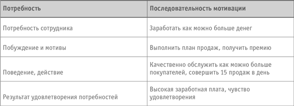 На практике именно так и происходит. Например, потребность продавца – зарабатывать в месяц не менее 30 000 руб. Мотивируем его: отработаешь 15 дней в месяце, выполнишь план продаж – получишь больше 30 000. Если нужны дополнительные знания и навыки для выполнения плана, отправим тебя на тренинг. Стимул – если будешь выполнять все требования, получишь положительную оценку от директора магазина и зарплату в полном объеме. Если будешь опаздывать и медленно обслуживать покупателей, оштрафуем.