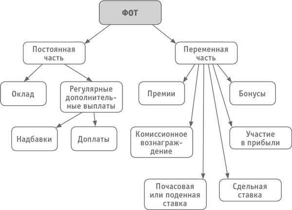 Самый мощный мотив – материальный, то есть заработная плата. Каждый сотрудник приходит на работу за вознаграждение. Схем и видов оплаты труда существует множество. Классическая, или базисная, показана на рисунке.