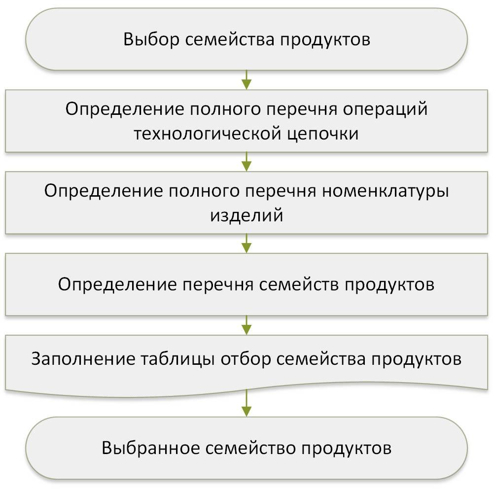 Семейство продуктов – это группа продуктов, которые проходят через подобные операции (этапы процесса) и общее оборудование в процессе преобразования. Другими словами – это несколько продуктов с идентичной технологией производства, как правило, незначительно различающиеся в параметрах операций. Такая группировка по семействам позволяет сконцентрироваться на особо массовом продукте, а следовательно и рассматривать наиболее «денежный» поток (содержащий максимальную сумму финансовых вложений). Шаги классического способа выбора представлены на рисунке 8.1.