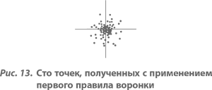 Правило 1. Самое легкое: не двигайте воронку безотносительно к тому, где шарик останавливается. Компьютерное моделирование ста последовательных бросаний шарика в соответствии с правилом 1 дает результат, показанный на рисунке 13. Нет ничего удивительного в том, что мы получаем фигуру рассеяния приблизительно в форме круга с центром на мишени.