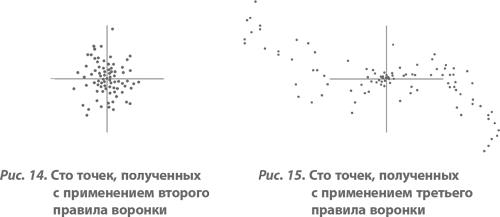 Мишень наносится на ткань, и воронка располагается над мишенью. Шарик бросают сквозь воронку, а положение, где он останавливается на столе, отмечают ручкой. Держатель и, следовательно, воронка могут передвигаться в соответствии с набором правил, которые мы сформулируем ниже. Шарик бросают в воронку во второй раз, позиция его остановки помечается, и воронка передвигается вновь. Процесс нужно повторить несколько десятков раз. Какие правила для перемещения воронки мы можем рассмотреть? Деминг предлагает четыре.