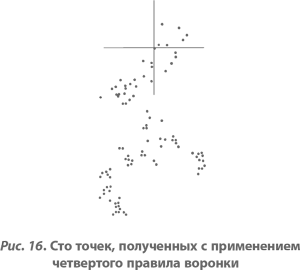 Учитывая, что вред, наносимый правилом 2, ограничен (это ни в коем случае не означает, что им можно пренебречь), а правило 3 проявляется достаточно редко, на практике самые серьезные проблемы может создать правило 4. Однако и оно коварно. В очень узком смысле оно и в самом деле уменьшает разброс. Если две рассмотренные выше предпосылки справедливы, то нельзя не согласиться с тем, что возможным способом минимизации среднего различия между произвольно взятыми исходами будет прицеливание воронки на точку предшествующего исхода. Но долговременный эффект такой локальной оптимизации мы уже видели на рисунке 16.