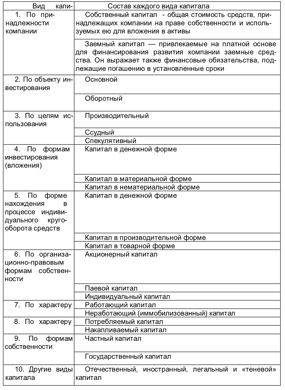 Таблица 11.1 – Классификация видов капитала предприятия /3/, с. 24