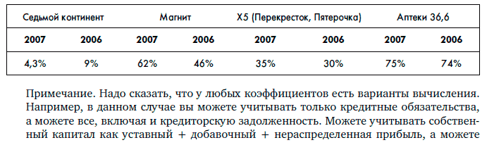 Как видите, действительно доля заемных средств в общем капитале «Седьмого континента» существенно увеличилась, что подтверждает наши выводы, которые мы получили в анализе Dupont. Кстати, обратите внимание на большую кредитную нагрузку «Аптеки 36,6», что также соответствует проблемам работы этой сети, о которых мы уже говорили. За 2007 г. серьезно выросла и долговая нагрузка «Магнита».