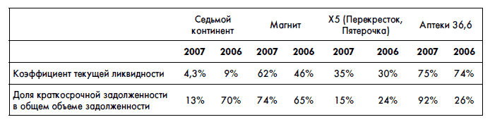 Очевидно, что в 2007 г. менеджмент «Седьмого континента» предпринял меры по улучшению финансового состояния компании. «Седьмой континент», хоть и увеличил свою долговую загрузку, но сделал это за счет долгосрочной задолженности, что не сказалось на ликвидности компании. Таким образом, к кризису компания должна была подойти в весьма неплохой форме. В то же время финансовое состояние «Магнита» не столь уж беспроблемно. Увеличились и долговая нагрузка, и доля краткосрочной задолженности в структуре обязательств. Это может привести к финансовым проблемам. И конечно, в наиболее плачевном состоянии находятся «Аптеки 36,6». Мало того что долговая нагрузка у компании – самая высокая из нашей выборки, но и почти вся задолженность в 2007 г. стала краткосрочной, т. е. пик выплат приходится на 2008 г. В условиях финансового кризиса и трудности получения новых кредитов компании будет очень нелегко расплатиться по долгам и выжить.