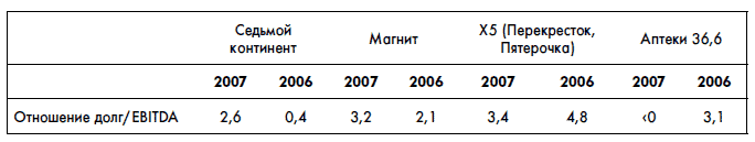 Как видите, в 2007 г. у всех наших ритейлеров, за исключением «Аптеки 36,6», долговая нагрузка была «в пределах нормы».