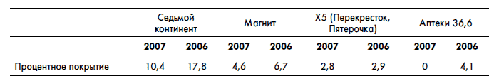 Коэффициент покрытия процентов для «Седьмого континента» за 2007 г. будет равен (3 405 481 + 363 602)/363 602 = 10,4. Сводные данные: