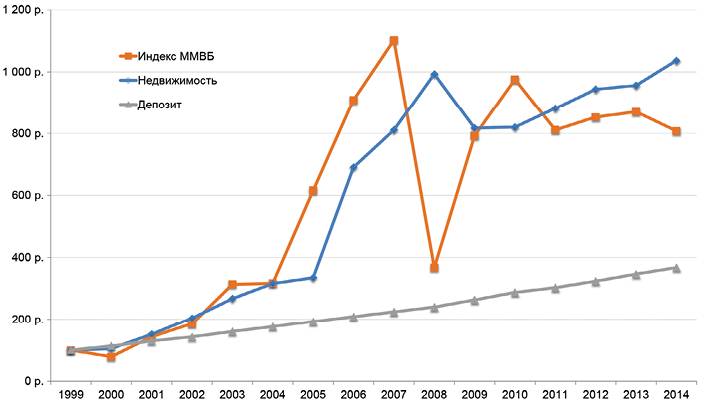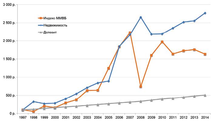 Чтобы проследить динамику стоимости этих активов в России, предположим, что мы вложили 100 руб. в конце 1997 года в акции (на примере индекса ММВБ), в недвижимость (индекс вторичной недвижимости Санкт-Петербурга) и, для сравнения, на депозит. На графике ниже можно увидеть, как изменялась бы сумма наших вложений.