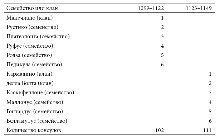 После первоначального приобретения привилегий сотрудничество прекратилось до 1154 г. (хотя действия Пизы показывают, что приобретение дополнительных привилегий было выгодным). Манечиано доминировали в консулате до 1122 г., Кармадино лидировали в нем с 1123 по 1149 г. (табл. VIII.1)[219].