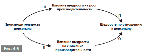 Эта диаграмма ясно показывает, что щедрость по отношению к персоналу может вести к двум результатам: росту или снижению производительности. Каждая из этих связей теперь недвусмысленна и стабильна, но действует или в разное время, или в разных обстоятельствах, которые по желанию можно включить в диаграмму.