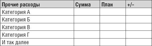 Введя суммы всех жизненно важных расходов в столбец «План», проведите под ними черту, оставив над ней одну пустую строку. Теперь начните заполнять остальные категории под чертой. Это прочие расходы – другими словами, все, без чего можно обойтись. Это не означает, что вы должны без всего этого обходиться. Вовсе нет. Я лишь прошу вас отделить чертой вещи, которые не являются жизненно необходимыми – то есть такие, без которых вы бы не погибли.