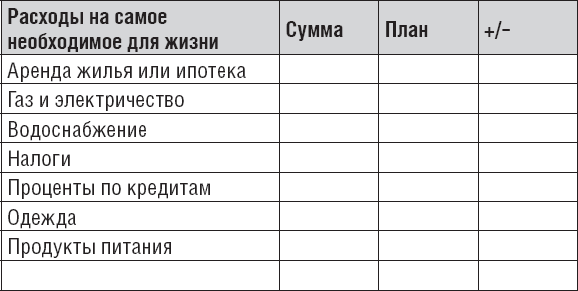 Начиная с основ жизни, которые я описал в главе 11, заполните столбец с категориями расходов. Как вы помните, три основы – это еда, тепло и кров, поэтому занесите в финансовый план все расходы, связанные с ними. Кроме того, включите в этот столбец минимальные взносы по кредитам, так как это ваши обязательные траты. Пока не заполняйте столбец с суммами расходов, оставьте только категории. У вас должно получиться примерно следующее: