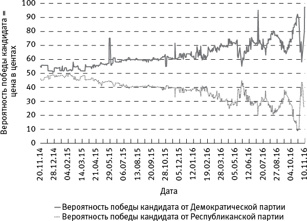 Если цена делает резкий скачок, то не исключено, что появился инсайдер – некто, имеющий недоступные другим сведения (например, рассказ любовницы одного из кандидатов или еще не опубликованные данные о росте безработицы) и на основе этой информации оценивающий вероятность исхода выборов не так, как другие игроки. Но после того как инсайдер купит (или продаст, в зависимости от того, что именно он знает) обязательства, цена изменится, и теперь – о чудо! – в ней будут отражены те сведения, доступ к которым только что был лишь у одного инсайдера.