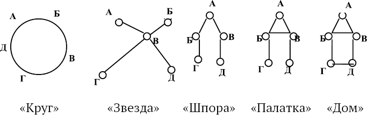 Наряду с прямыми коммуникационными связями возможны перекрестные, т. е. между Б и Д, В и Г, как официальные, так и неофициальные. Помимо рассмотренных коммуникационных сетей существует значительное количество их разновидностей, более сложных по структуре и характерных для очень крупных организаций.