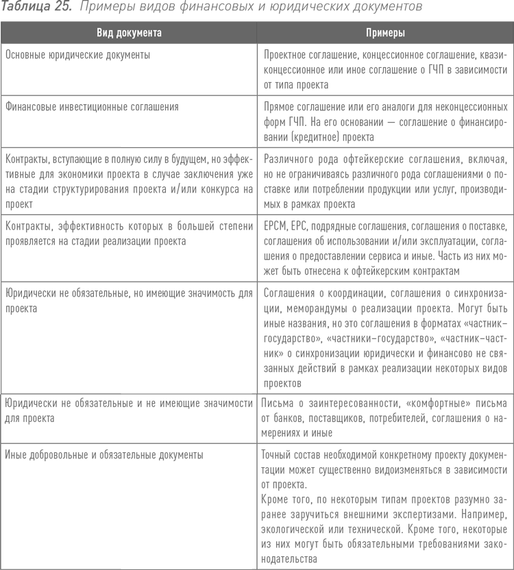 Существенная сложность документального оформления сделок инвестиций в инфраструктуру состоит не только в том, что их просто очень много. В большей степени ситуация усугубляется тем, что зачастую происходит путаница в том, на каком этапе и какие именно документы оформляются. Примеры различных видов финансовых и юридических документов приведены в таблице 25.