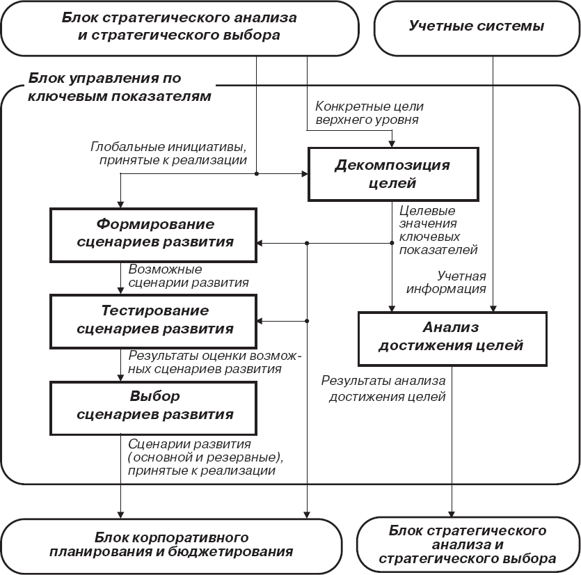 Целевые значения ключевых показателей, сформированные модулем декомпозиции целей, поступают в модули формирования и тестирования сценариев развития (для выявления степени влияния того или иного сценария на ключевые показатели), в модуль план-факт-анализа (для констатации отклонений фактических значений ключевых показателей от целевых и выявления причин этих отклонений), а также в блок корпоративного планирования и бюджетирования (для использования в качестве отправной точки для формирования планов и бюджетов).