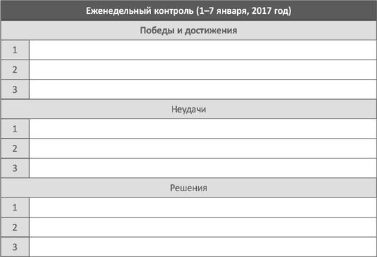 Еженедельный отчет стоит на третьем месте в списке главных методов, которые нельзя упустить, – после продуманного плана на день и целевых блоков времени, выделенных на приоритеты. Успешно проведя еженедельный контроль (хотя бы раз), вы получите предельно четкое представление о своем графике и как на ладони увидите все свои задачи, важные привычки и обязательства.