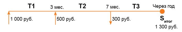 В каждый временной подпериод (T1, T2, T3) сумма вложенных средств была разной. В подпериод T1 – 1000 рублей, T2 – (1000 + 500) рублей, T3 – (1000 + 500 – 300) рублей. Кроме того, сами по себе эти временные подпериоды не равны. T1 – 90 дней, T2 – 120 дней, T3 – 155 дней. Поэтому необходимо согласовать суммы вложенных средств с количеством дней в подпериоде, определив таким образом среднюю «рабочую» сумму (средневзвешенную по времени сумму вложенных средств) на рассматриваемом периоде.