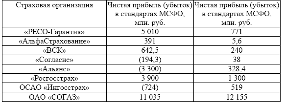 Начиная с 2013 г. страховые организации в форме открытых акционерных обществ в обязательном порядке составляют отчетность по международным стандартам.[17] Крупнейшие компании рынка начали формировать отчетность по стандартам МСФО гораздо раньше. После выхода соответствующего закона, ЦБ РФ особенно тщательно изучает консолидированную отчетность топ-10 российских страховщиков. Анализ показателя чистой прибыли за 2013 г. (одного из ключевых индикаторов эффективной деятельности организации) крупнейших компаний российского страхового рынка показал достаточно любопытные результаты. В частности, у большинства страховщиков чистая прибыль по стандартам МСФО в несколько, а то и в десятки раз превышала аналогичный показатель по стандартам РСБУ (см. табл. 1).