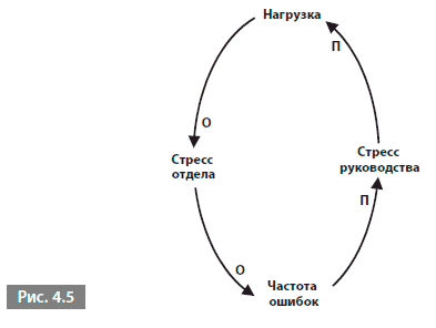 Она очень похожа на петлю из примера о бэк-офисе, но есть два отличия. Во-первых, я заменил концепцию возможности справляться на стресс отдела, и в результате две О из предыдущей диаграммы изменились на П. Теперь здесь нет ни одной О, и это усиливающая петля: по мере увеличения нагрузки растет стресс отдела, повышая частоту ошибок и увеличивая стресс руководства, а соответственно, и еще больше увеличивая нагрузку. Эта диаграмма описывает ту же ситуацию, что и предыдущая, просто я выбрал другие слова. В результате расстановка букв П и О тоже изменилась (это второе отличие), но описываемая ситуация и поведение петли остались теми же.