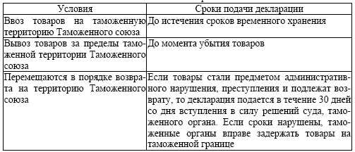 Таблица 6 – Сроки представления таможенной декларации в таможенные органы