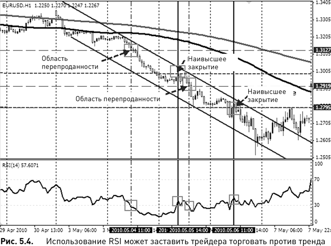 RSI считается перепроданным, когда осциллятор опускается ниже уровня 30. На рис. 5.4 EURUSD в первый раз опускает RSI ниже уровня 30, когда цена уходит ниже 1,3127. Это служит сигналом о том, что цена перепродана и ее должна ожидать коррекция. Трейдер, следящий за RSI, может склониться к тому, чтобы купить или закрыть позицию на этом уровне.