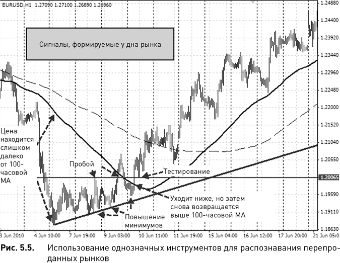 Например, на рис. 5.5 показано, что достижению дна EURUSD в июне 2010 г. предшествовал ряд сигналов о том, что рынок перепродан и готов для движения обратно вверх. Во-первых, цена сильно удалилась от линии 100-часовой MA, которая находилась на 1,2180, а цена – на 1,1880. Когда цена уходит слишком далеко, следом часто наступает период консолидации и/или коррекция. Означает ли это сигнал о покупке или продаже? Нет. Однако у трейдера появляется причина думать, что рынок приближается ко дну и можно использовать этот минимум как уровень стоп-лосса.