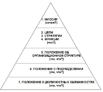Она находится на вершине пирамиды организационного программирования (рис. 6.1) Именно благодаря миссии через осознание целей и стратегий, а также перечня направлений коммерческой деятельности, компания может определиться со своим функционалом – перечнем постоянно воспроизводимых бизнес-функций, функций менеджмента и функций обеспечения. Это позволяет сформировать базовые корпоративные регламенты – положение об организационной структуре компании в целом и пакет положений об отдельных подразделениях, закрепляющих зоны ответственности менеджмента. Дальнейшая детализация этих документов дает возможность получить регламенты управления персоналом – положение о функциональных обязанностях и должностную инструкцию.