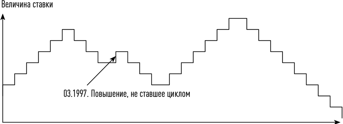 03.1997 – единственное непоследовательное повышение с 5,25 до 5,5 % за десятилетний период. Это повышение не стало началом цикла роста ставок