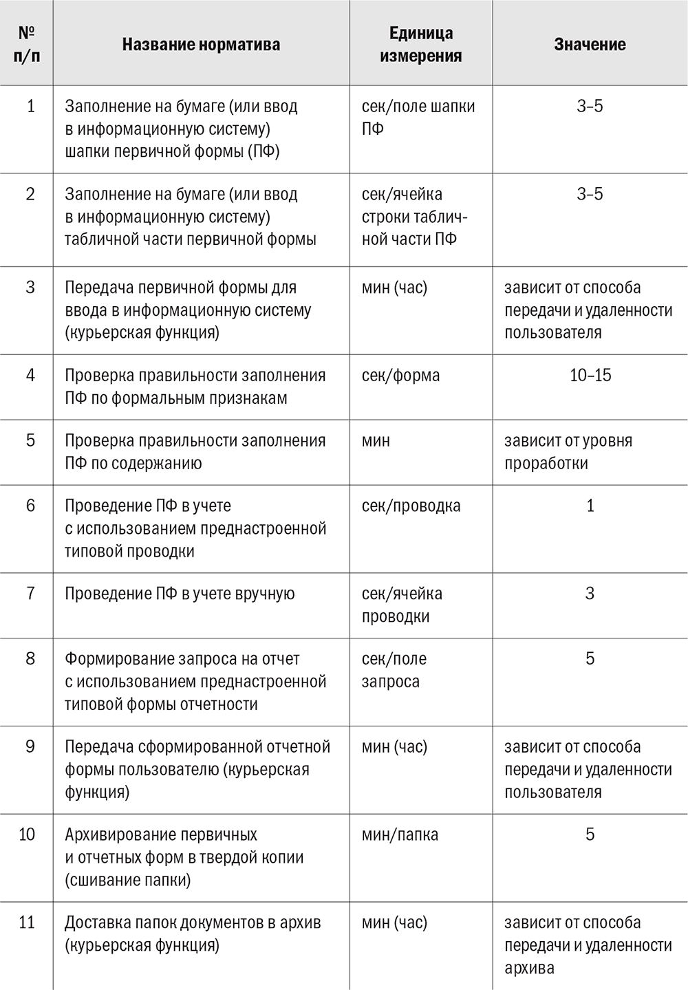 Таблица 5.4. Примеры нормативов на выполнение основных учетных функций