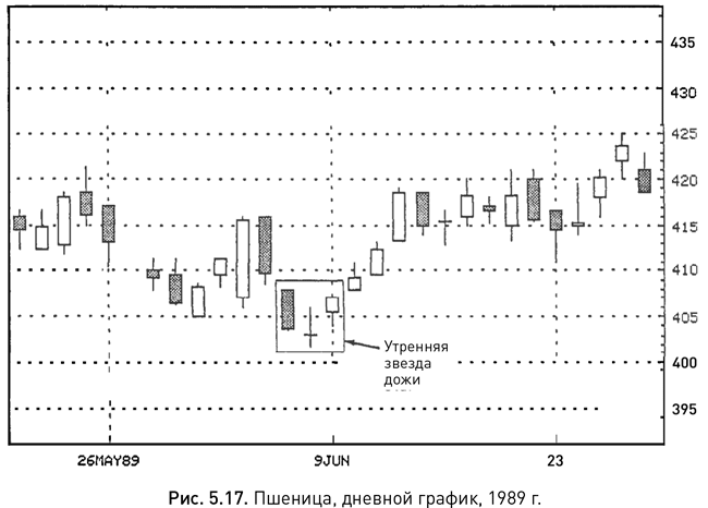 На рисунке 5.17 появление звезды дожи в начале июня остановило наблюдавшееся до этого снижение (напомним, что свеча считается звездой, даже когда ее тень перекрывает часть тела предыдущей свечи, как в данном примере). Следующая белая свеча подтвердила смену тренда и завершила формирование модели «утренняя звезда дожи».