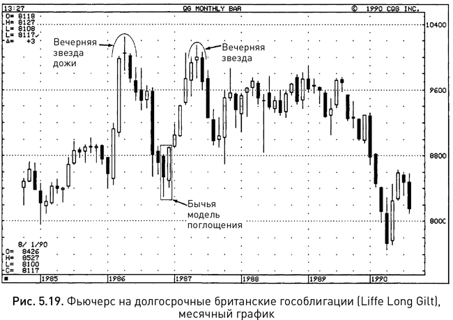На рисунке 5.19 вы найдете как вечернюю звезду дожи, так и обычную вечернюю звезду. Первая из этих моделей образовалась в период с марта по май 1986 г. и поставила финальную точку в ралли, наблюдавшемся в предыдущие месяцы. После этого началось падение, которое, в свою очередь, завершилось бычьей моделью поглощения. В дальнейшем цены вновь демонстрировали рост до возникновения вечерней звезды в середине 1987 г.