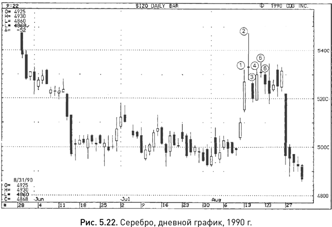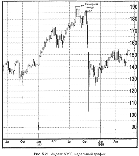 Вечерняя звезда дожи, возникшая за несколько недель до обвала американского фондового рынка в 1987 г., тоже не вполне совпадала с идеальным вариантом этой модели: между ее первой и второй свечами отсутствовал гэп (см. рис. 5.21). Однако, как и в предыдущем примере, здесь следовало проявить гибкость, поскольку исторические данные свидетельствовали о том, что цены открытия рынка слишком часто совпадают или почти совпадают с предыдущими ценами закрытия.