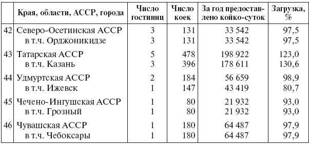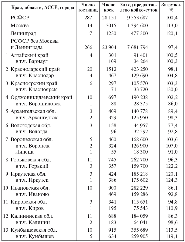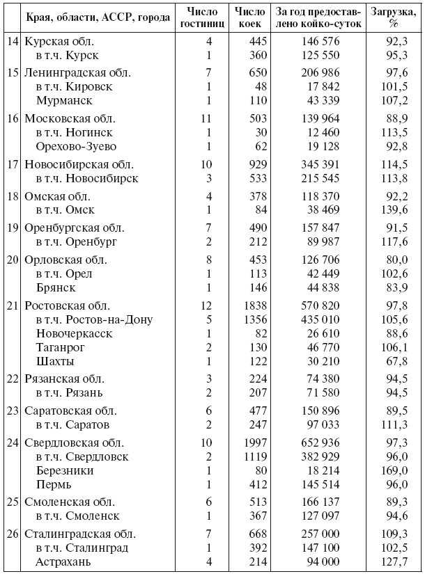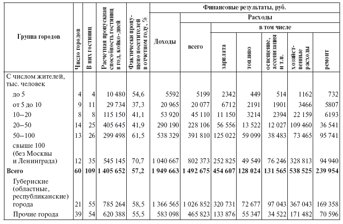 Из данных таблицы, отражающих состояние гостиничного фонда РСФСР в 1936 г. (табл. 7.4)[607], видно, что для имевшихся на тот момент 287 гостиниц загрузка составляла 100,4 %.