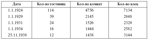 Из письма управляющего трестом «Московские гостиницы» Самохина наркому коммунального хозяйства РСФСР К.Д. Памфилову в декабре 1938 г. можно реконструировать общую динамику развития гостиничного хозяйства столицы на протяжении 1920—1930-х годов (табл. 7.2)[577].