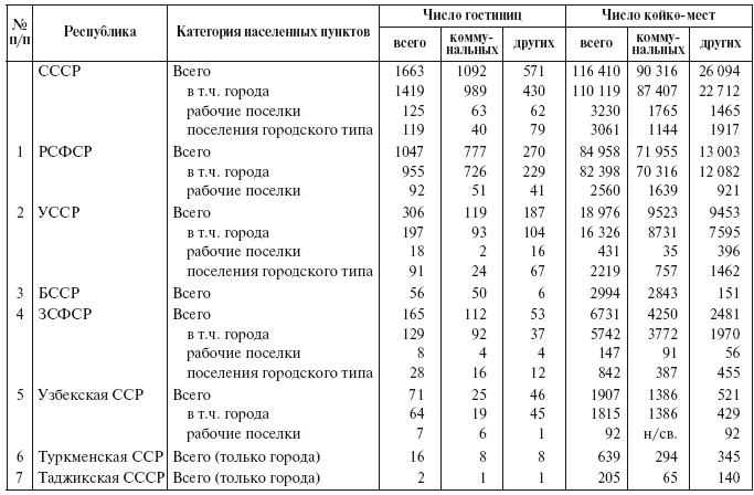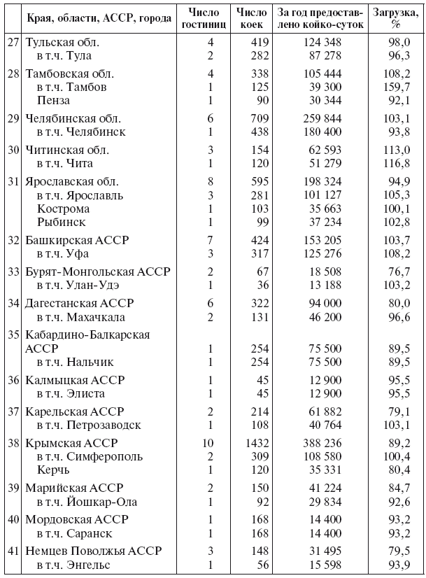 Но при таком благоприятном усредненном показателе данные по отдельным городам демонстрируют большой разброс по загруженности гостиничного фонда: от 67,8 % в г. Шахты Ростовской области до 169 % в г. Березники Свердловской области. Среди регионов «чемпионом» по перегруженности гостиниц была Татарская АССР (123 %), опережавшая даже Москву (113 %) и Ленинград (120,1 %). Минимальную загрузку гостиниц давала Бурят-Монгольская АССР (76,7 %), хотя показатели по Улан-Удэ были вполне сопоставимы с общероссийскими – 103,2 %. Не меньший разброс демонстрировала и общая обеспеченность регионов гостиницами. Рекорд в этом отношении принадлежал Московской области (14 гостиниц в самой столице и 11 в области), а минимальная обеспеченность гостиницами была отмечена в Кабардино-Балкарской, Калмыцкой, Мордовской, ЧеченоИнгушской и Чувашской АССР (в каждой республике по одной гостинице, расположенной в столице автономии). В первой десятке по обеспеченности гостиницами, кроме Московской области, располагались: Краснодарский край (20 гостиниц), Ленинградская область (вместе с Ленинградом – 14 гостиниц), Ростовская область (12), Горьковская и Калининская области (по 11), Ивановская, Куйбышевская, Новосибирская и Свердловская области, Орджоникидзевский край и Крымская АССР (по 10), Орловская и Ярославская области (по 8 гостиниц в каждой). Как мы видим, в среднем наиболее обеспечены гостиницами были области, а наименее – автономии[608].