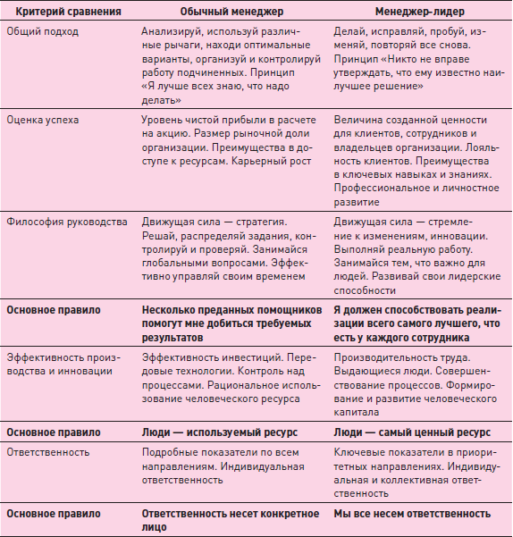 Сравнительная характеристика обычных менеджеров и менеджеров нового типа (лидеров) приведена в табл. 4.2.